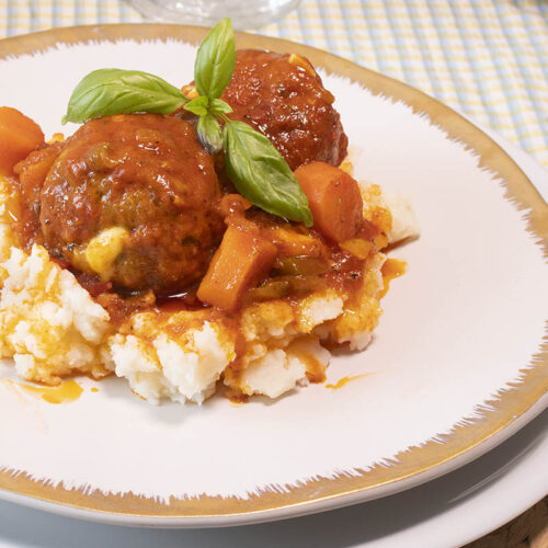 - Emplatamos poniendo una buena base de puré de patatas y en el centro dos albóndigas por comensal, un cucharón de salsa con verduras y decorar con unas hojitas de albahaca.
