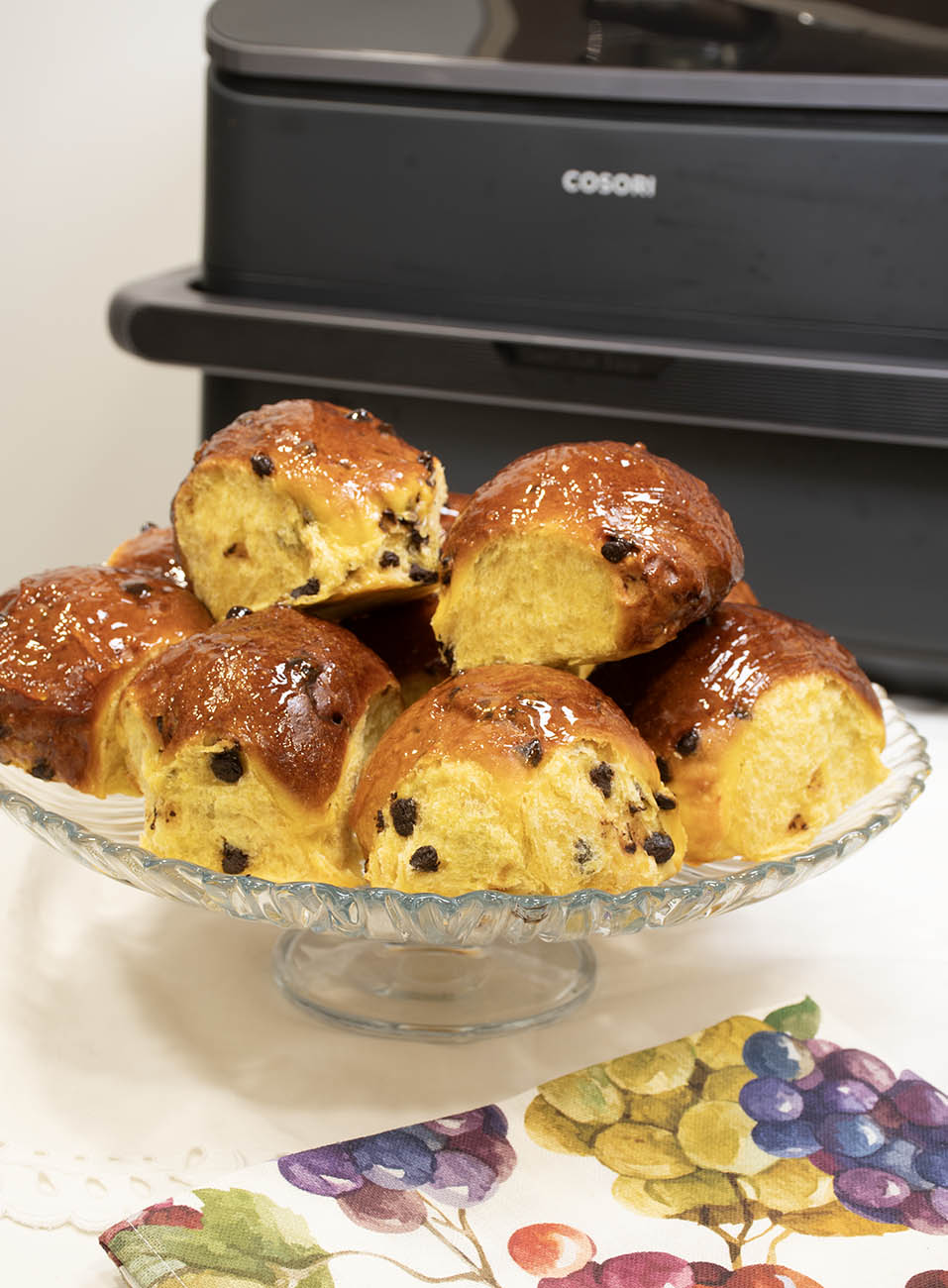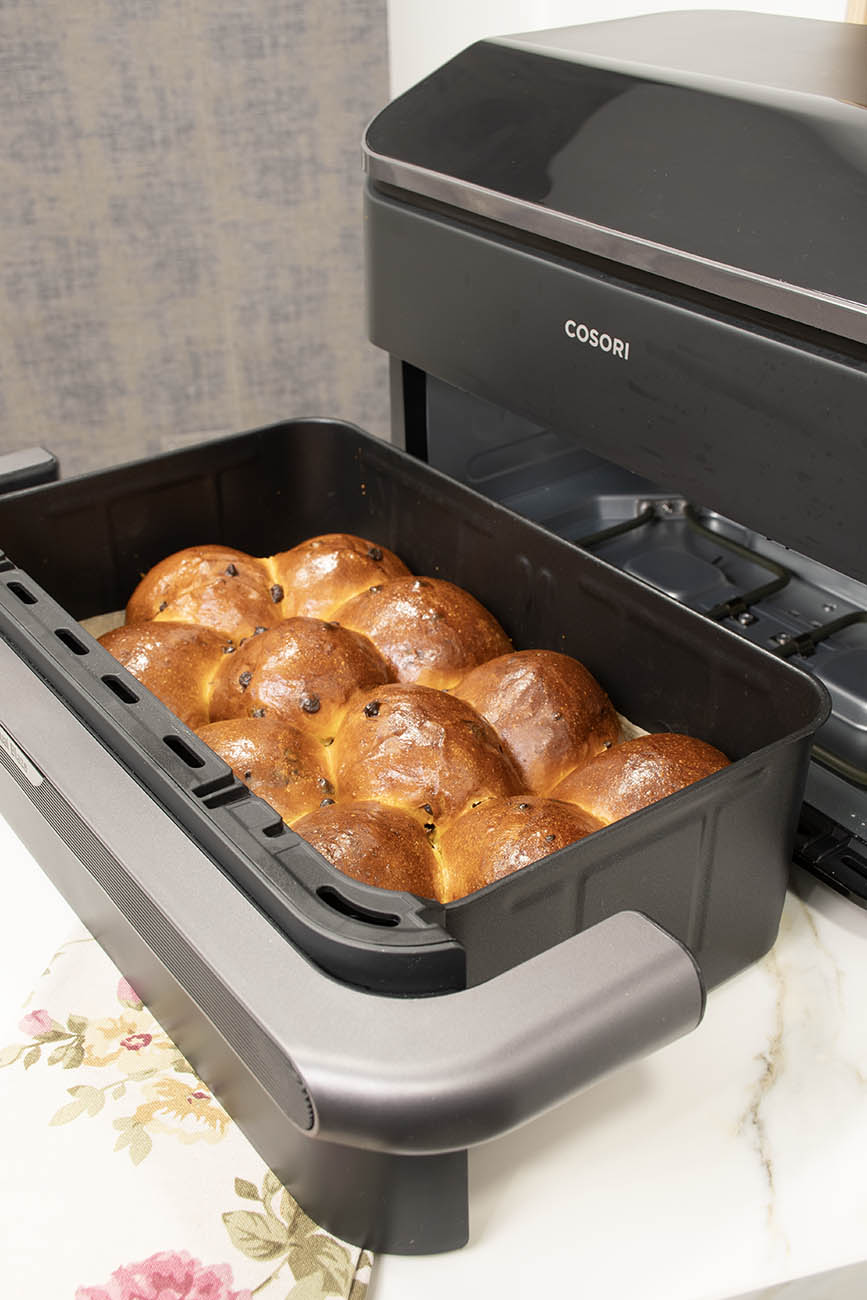 Esta receta la he preparado con la freidora de aire Cosori Dual Blaze TwinFry de 10 L, y el resultado ha sido excelente. Su gran capacidad me ha permitido hornear casi una docena de bollitos de una sola vez, sin encender el horno, algo muy práctico en repostería. El reparto uniforme del calor consigue bollos bien dorados por fuera y muy esponjosos por dentro, con menos tiempo y menor consumo energético. Una freidora potente, cómoda y muy versátil, perfecta tanto para recetas dulces como saladas.