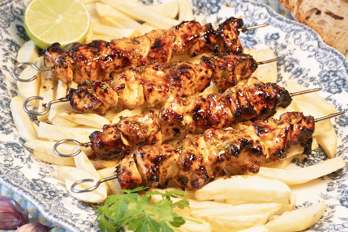 - Finalizada la cocción, disponer las brochetas sobre una fuente de patatas fritas, volver a pintarlas con la salsa y acompañar con pimientos de Padrón, pan y ensalada