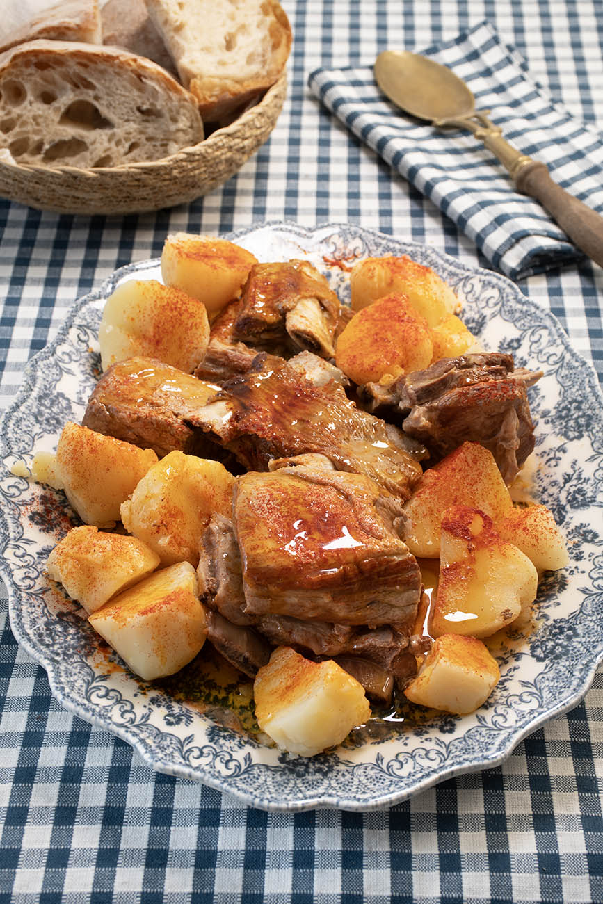 - Sirve caliente en una fuente la carne y las patatas con un poco de caldo de cocción, espolvorea pimentón y rocía con aceite de pimentón o de oliva