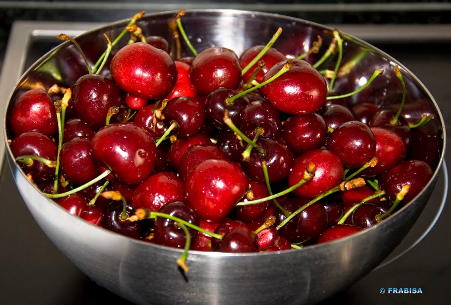 Estamos a rebosar de cerezas , inundan todas las estanterías de las fruterías y su colorido acaparan la atención. Siempre hago un par de kilos en conserva y son estupendas para a lo largo del invierno tenerlas a mano para hacer un bizcocho, acompañar un helado, un cóctel o comerlas así, sin otra intención que jugar con ellas un ratito en el interior de la boca antes de zas, comerlas de un bocado.