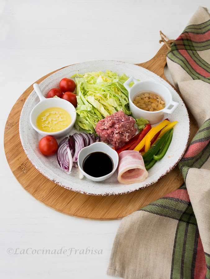 - – Rehogar en una sartén (o wok) en un par de cucharadas de aceite de sésamo, las verduras cortadas durante unos cinco minutos. Añadir la carne picada y el bacon, rehogar durante un par de minutos y salpimentar, agregar una cucharadita de salsa de Soja, pizca de jengibre rallado y las uvas pasas, revolver y apagar el fuego. No es necesario que queden muy cocidas, es más, en muchas recetas el rellenos se pone crudo, yo he preferido darle un toque de salteado en la sartén.