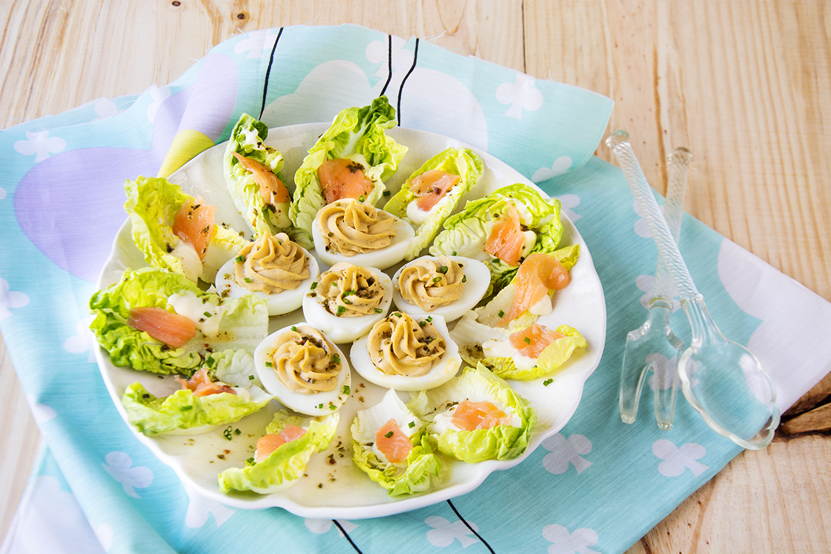 - – Rodeamos los huevos rellenos con hojas de cogollos, en cada una ponemos una minicucharadita de mayonesa y un trozo de salmón ahumado, vertemos por encima un chorrito de aceite de oliva virgen extra , espolvoreamos cebollino picado fino y un chorrito de salsa de vinagre de módena.