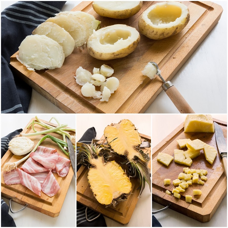 - 3- Salpimenta, mezcla y añade la piña cortada en daditos, apaga el fuego. Deja templar unos minutos y añade el yogur griego, revuelve y rellena las patatas.
