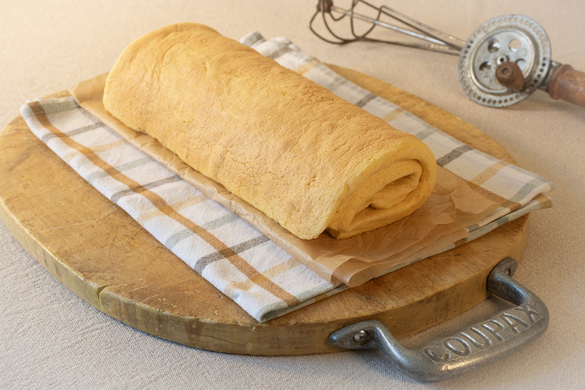 - Finalizado el horneado, extiende un paño limpio de algodón o un papel de hornear limpio, vuelca boca abajo sobre el paño la plancha de bizcocho, retira con cuidado el papel vegetal y enrolla con cuidado o déjalo sin enrollar hasta utilizar. Si lo dejas sin enrollar, cúbrelo con papel de hornear y film para evitar que se reseque.