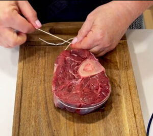 - Preparamos los trozos de osobuco haciendo incisiones en la piel que los circunvala para que no se arrugue durante la cocción y a continuación los ataremos con un hilo de cocina (sin apretar) para intentar que guarden la forma, no siempre se consigue esto último pero vamos a poner de nuestra parte que para que suceda.