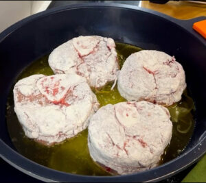 - Dorar en un poquito de aceite caliente los ossobucos rebozados, vuelta y vuelta para formar una crostita y proteger la carne durante el estofado. Ir pasando para una fuente. Cuando los demos vuelta y sobre la parte que ya hemos dorado, espolvoreamos sal. Pasar para una fuente y reservar.
