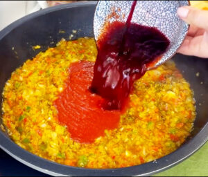 - En la misma olla (si fuera necesario añadimos un poco más de aceite) añadimos la cebolla, los ajos y los pimientos picados (no es necesario que estén muy bien picados porque trituraremos la salsa) espolvoreamos sal, orégano y sofreímos durante unos minutos hasta que evaporen líquido.Añadimos el tomate triturado, el vino tinto, el vinagre balsámico de Módena, el caldo de carne, la hoja de laurel, las hierbas aromáticas atadas con un cordel para después poder retirarlas, las guindillas ensartadas en un palillo para también poder retirarlas al final de la cocción, espolvorear sal, revolver.