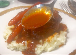 - Ponemos una ración de puré en los platos, alisamos el puré sobre el plato y encima colocamos un osobuco en cada plato, 2 zanahorias, bañamos con una buena cucharada de salsa, decoramos con una ramita de perejil y servimos.