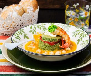 - Sobre la crema de calabaza y alrededor del flan, coloca garbanzos y trozos de langostinos de modo armonioso.