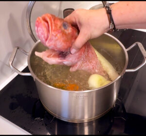 - Ponemos agua abundante en la olla y añadimos la cebolla, el puerro, la zanahoria, el laurel y las aromáticas, tapamos y dejamos que llegue a punto de ebullición, en ese momento ponemos sal e introducimos el cabracho. Volvemos a tapar la olla y esperamos a que vuelva a tomar punto de ebullición, apagamos la placa y aguardamos a que pasen 10 minutos. Durante esos 10 minutos de espera el pescado terminará de cocinarse.