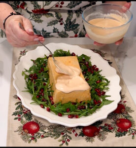 - Ponemos una cama de rúcula en la fuente de servir, la rociamos ligeramente de aceite de oliva y desmoldamos el pastel sobre la misma con cuidado y pasando suavemente un cuchillito fino todo alrededor de las paredes del molde a fin de ayudar a que se despegue.