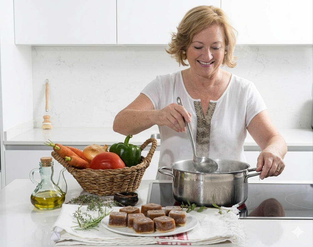 - ¡Úsalas cuando quieras!: Añade una o dos pastillas directamente al cazo mientras cocinas: transforman unas lentejas, elevan un arroz o dan una profundidad inesperada a unas simples patatas cocidas. Y si las usas como su nombre indica —una pastilla disuelta en medio litro de agua caliente—, obtendrás un caldo limpio y riquísimo, sin conservantes ni artificios. ¡Os lo aseguro, funciona!