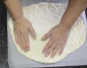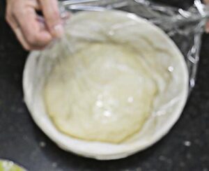 - Cuando la masa esté lista, espolvorea un poco de harina en una superficie de trabajo (puede ser la encimera o la mesa de la cocina), aplasta ligeramente la masa con las manos.