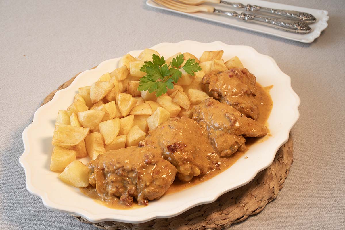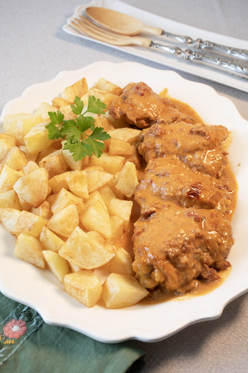 La base de esta receta comienza con un adobo aromático que potencia la carne, seguida de una salsa exquisita donde el tomate, el vino blanco y los tomates secos se fusionan con el queso parmesano y la nata, creando una combinación perfecta de cremosidad y sabor. Un toque de albahaca fresca y chile rojo aporta el equilibrio ideal entre frescura y un ligero toque picante.