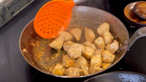 • Poner una sartén al fuego con un par de cucharadas de aceite de oliva y dorar levemente los ajos picaditos, enseguida añadir el pollo y dorar-cocinar a fuego alto. (Se hace rápido)
