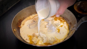 • En la misma sartén que hemos hecho el pollo, añadimos el queso gorgonzola y la nata, espolvoreamos pizca de pimienta negra (no pondremos sal porque el queso ya contiene, si acaso al final de la cocción rectificamos).