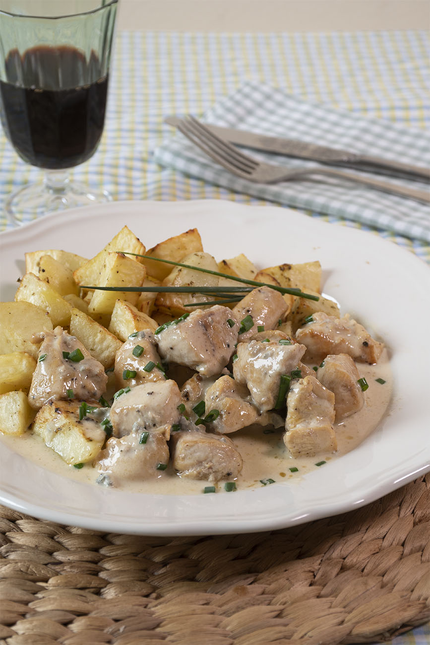 • Servimos con patatas fritas (también puede ser pasta, puré, verdura, arroz blanco), cubrimos el pollo con bien de salsa, espolvoreamos más cebollino picadito y disfrutamos.